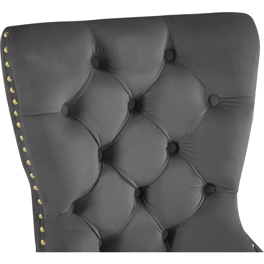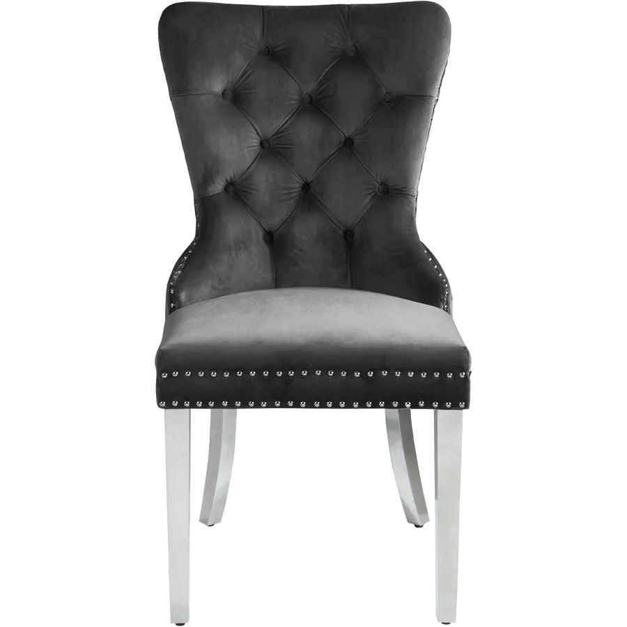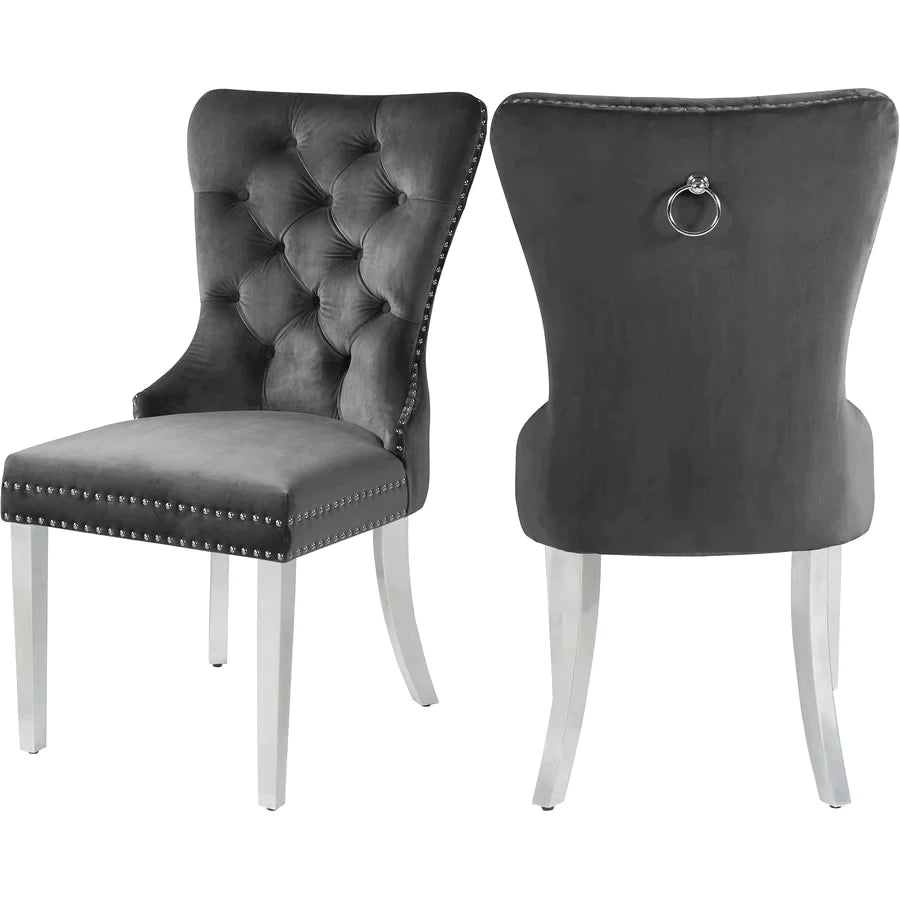 Material: Grey Velvet Dining Chair with Deep Tufting, Chrome Knocker, Polished Chrome Legs, Nail Head Details.
