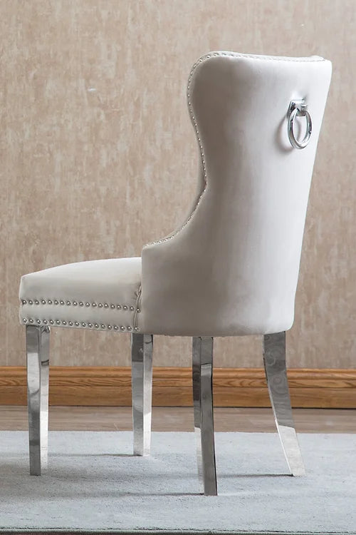 Material: Creme Velvet Dining Chair with Deep Tufting, Chrome Knocker, Polished Chrome Legs, Nail Head Details.