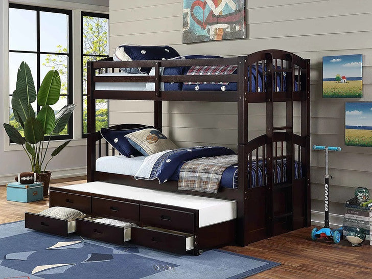 This single White Wooden Captain Bunk Bed by IFDC features an espresso finish and guard rails for safety on the top bunk as well as with a ladder for accessing it. It includes a pull-out single trundle bed, 3 pull-out storage drawers, and mattress support.
