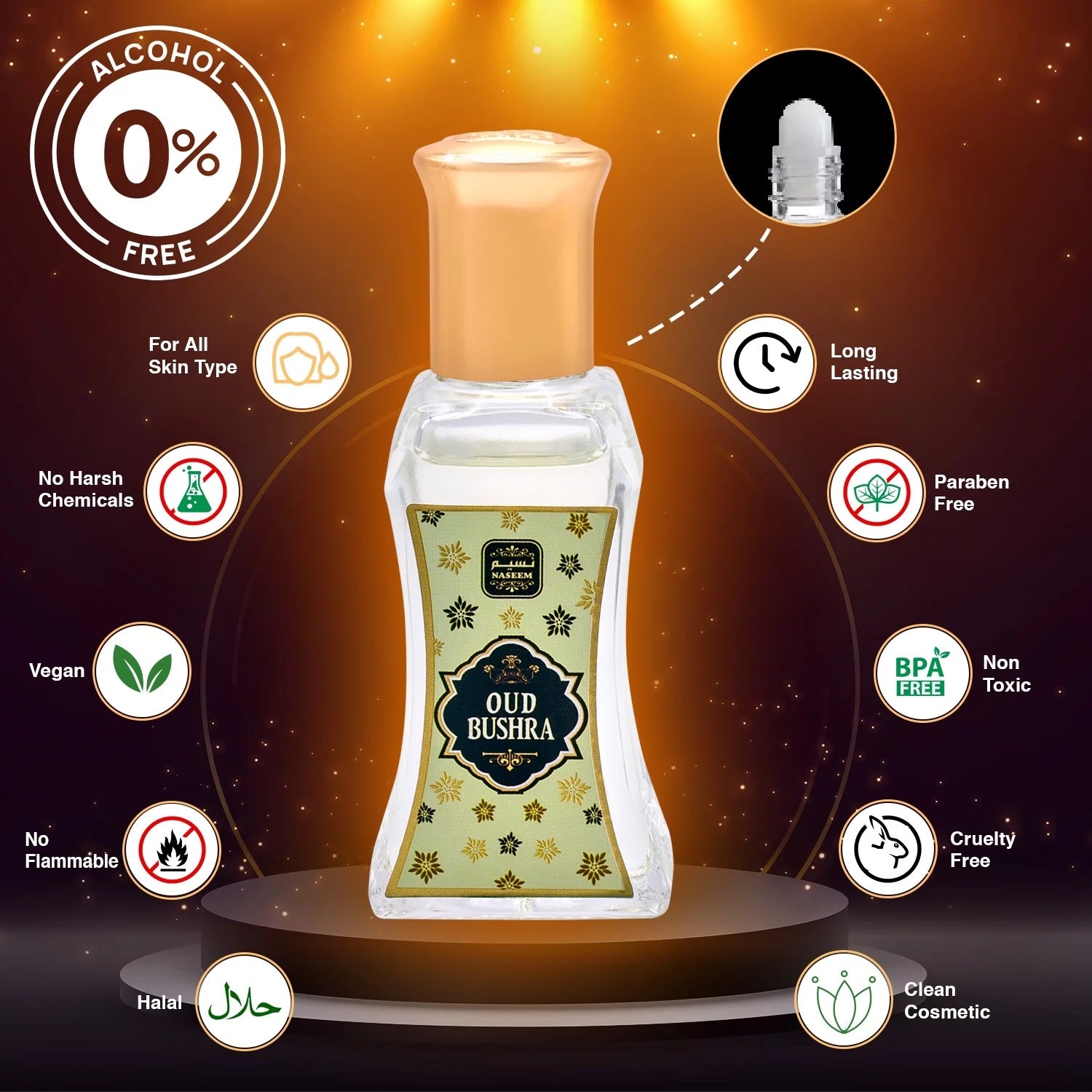 - Safe For All Types Of Skins: Our Oud Bushra perfume oil fragrance is perfect for sensitive skin types. Naseem alcohol free perfume oil is hypoallergenic and won't irritate the skin. The Arabian fragrance concentrated perfume oil roller comes with factory-sealed packaging and stylish metallic and glass perfume oil bottles. The sweetness and warmth of its composition make it ideal for every occasion.