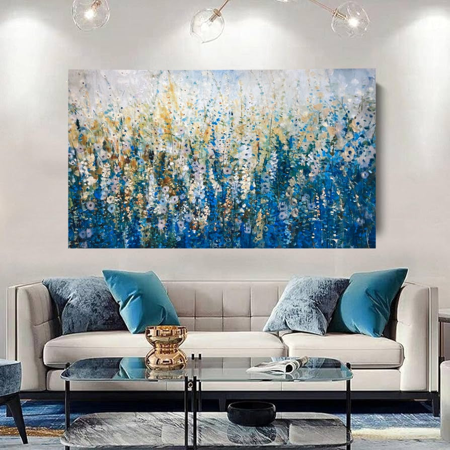A mass of tall blue wildflowers growing amid grasses in a prairie-like setting. This impressionist-style painting in warm autumnal hues would be perfect in a living room, dining room or den.