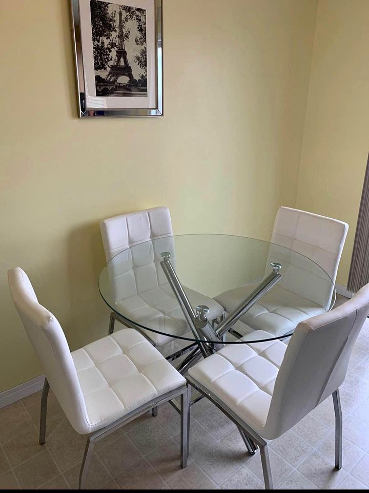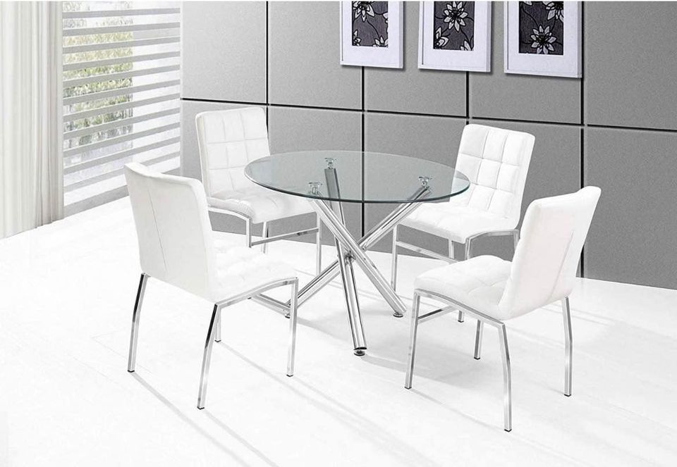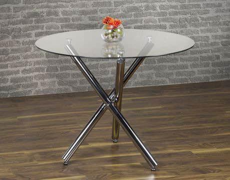Weston dining set gives any dining space a sleek and modern look. The tempered glass table top resting on a sculptured chrome base gives a modern feel. The stylishly designed chrome base also adds to its beauty
